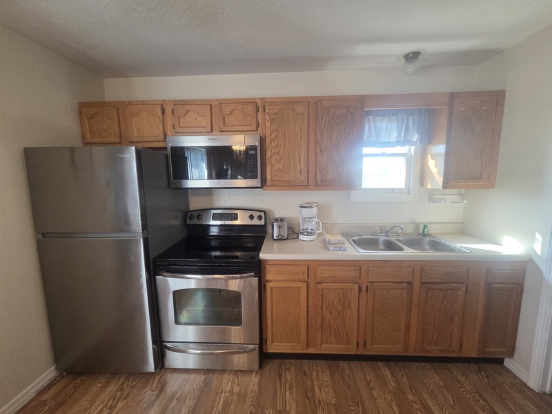 The kitchen has a refrigerator, range with oven, microwave, toaster, coffee maker, cookware, tableware, and lots of counter space and cupboards.
