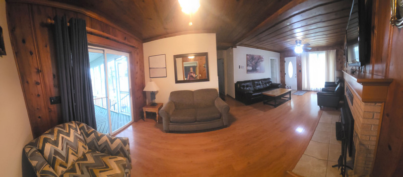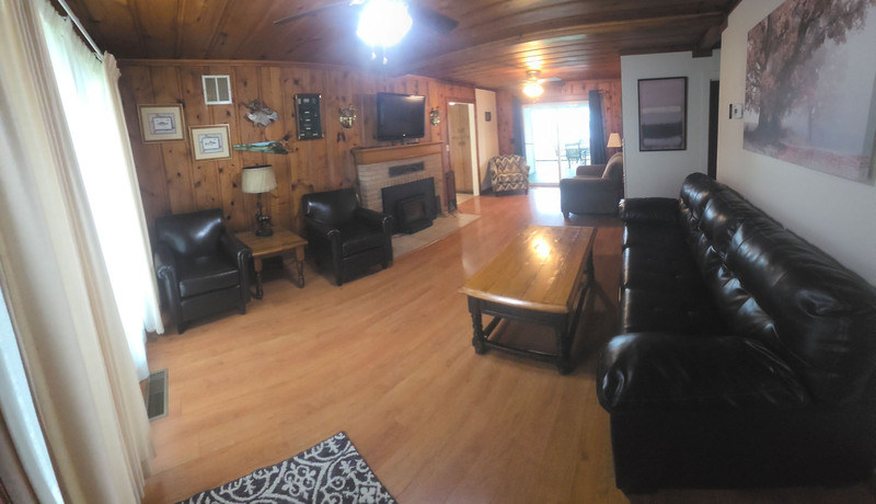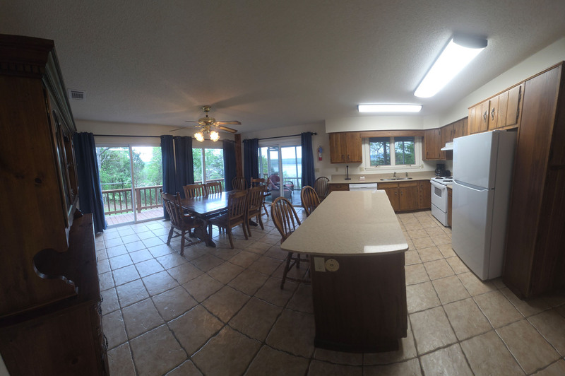 Three sets of sliding glass doors in the kitchen/dining area give access to the deck and the covered porch. If you want room for several people to mingle before and after meals, you'll find the flow between the deck, table, kitchen, and covered porch very congenial. No matter which way you turn there's plenty of room and ever-present views of Lake Norfork.